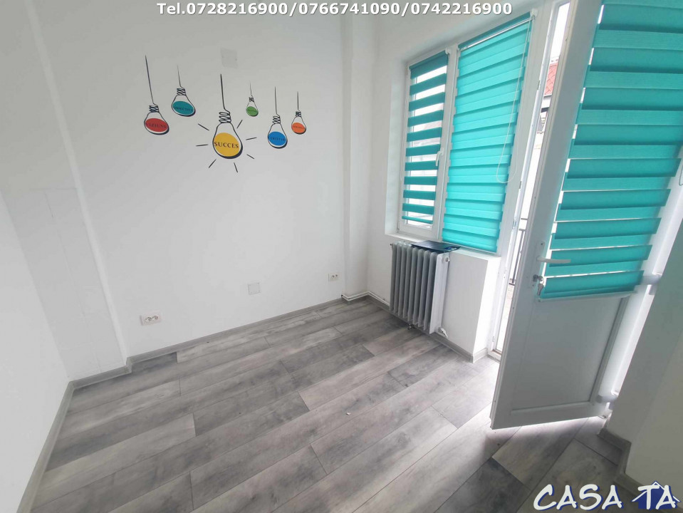 Agentia Imobiliara CASA TA ofera spre Inchiriere Spatiu Birou, situat la Etajul 1 pe Strada Tudor Vladimirescu. Spatiul are suprafata de 8 mp. + grup sanitar si un balcon. Pretabil pentru diverse activitati economice, zona fiind intens circulata si cu o vizibilitate foarte buna, usor de identificat. Finisaje: gresie, faianta, geamuri termopan, usa PVC, incalzire Centrala Termica. Utilitati: apa curenta, curent electric, canalizare, CATV, Internet. Pret: 100 Euro/Luna + 1 luna Garantie. Comision 0% la chirias.